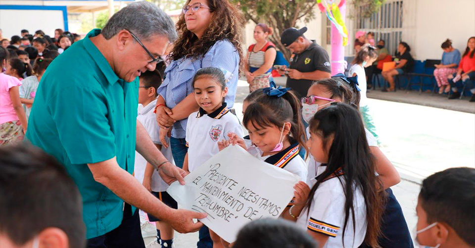 Allí el munícipe fue recibido por el director de la escuela, así como por maestros, padres de familia y alumnos. Durante este encuentro, escuchó atentamente las solicitudes de la comunidad educativa, entre las que destacaron; la rehabilitación de la techumbre de la plaza cívica, la construcción de una barda perimetral, rehabilitación de sanitarios, labores de pintura en las aulas, así como la restauración del desayunador escolar.
