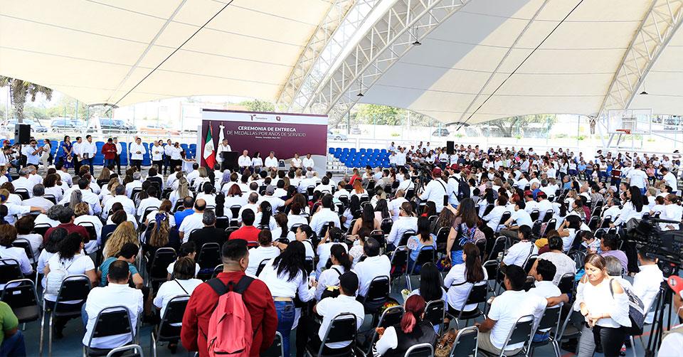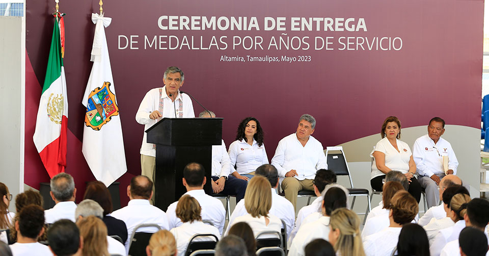Al presidir junto al alcalde de Altamira, Armando Martínez Manríquez, la entrega de medallas en reconocimiento a la antigüedad en el servicio a 186 trabajadores de la salud, en el Centro de Bienestar y Paz de esta ciudad, el gobernador, recordó que es un compañero más de los trabajadores de este sector y refrendó toda su disposición para dar cumplimiento al precepto legal que hace de la salud un derecho humano.
