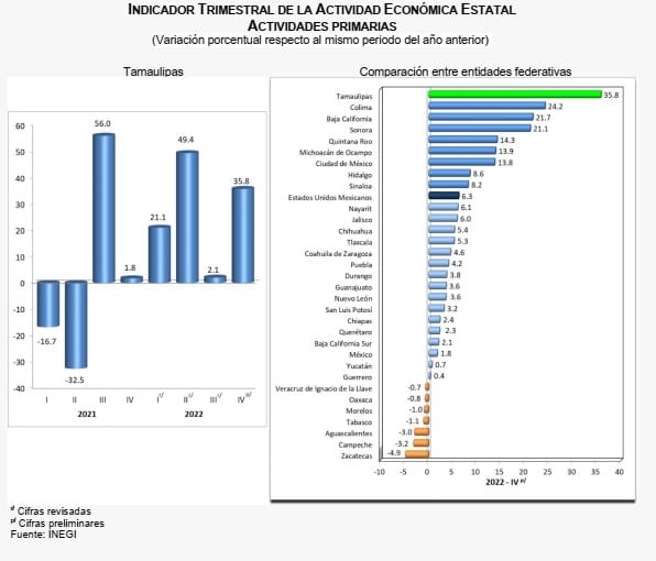 Ciudad Victoria, Tamaulipas.- De acuerdo a los indicadores que proporciona el Instituto Nacional de Estadística y Geografía (INEGI), Tamaulipas se colocó en el primer lugar nacional durante el cuarto trimestre del 2022 en lo que respecta a las actividades primarias como lo son el sector agricultura, crías, exportación de animales y aprovechamiento forestal reportando un aumento anual de 35.8 %.