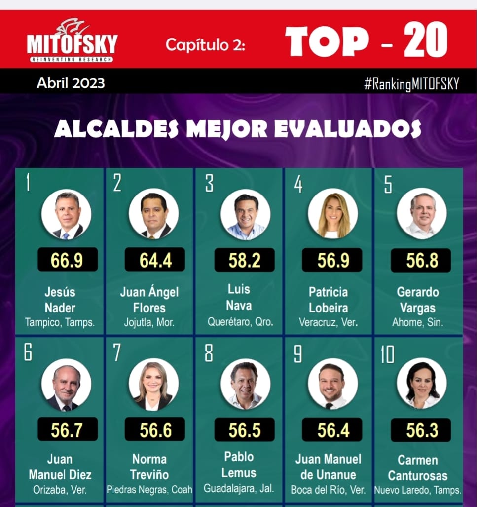 En el reporte los alcaldes de Jojutla, Morelos, Juan Ángel Flores; de Querétaro, Querétaro, Luis Nava; y de Veracruz puerto, Patricia Lobeira, se ubicaron tras Nader Nasrallah.