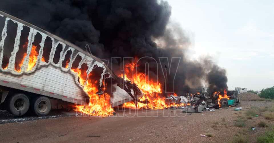 El accidente se registró hoy por la tarde a la altura del kilómetro 158 de la vía libre hasta donde también llegaron elementos de Protección Civil y Bomberos de Nuevo Laredo para sofocar el fuego.