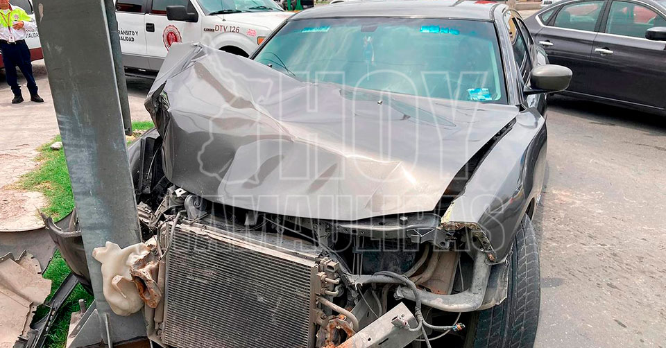 Nuevo Laredo, Tamaulipas.— Una mujer estrelló su automóvil contra la base de un anuncio instalado en la importante avenida César López de Lara en Nuevo Laredo, causando daños materiales al municipio.