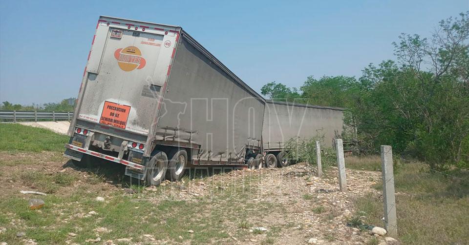 González, Tamaulipas. – Un chofer de tracto camión doble articulado se quedó dormido al volante y terminó por salirse de la carretera, hasta detenerse entre el monte y tras derribar las vallas de contención.