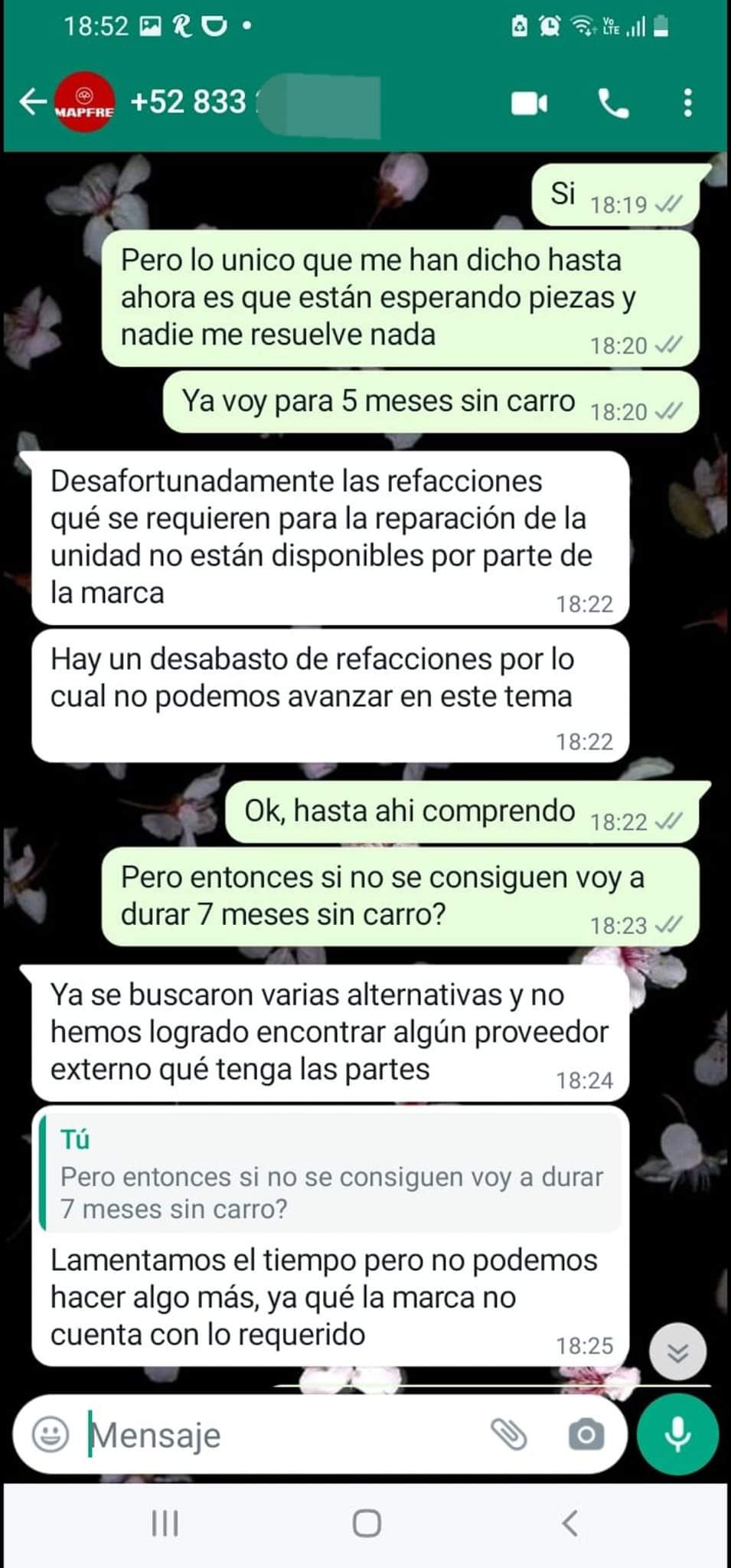 En la publicación, subió unas fotografías del estado de su vehículo y capturas de pantalla, donde la empresa le argumenta no contar las refacciones que requiere para la compostura de su automóvil.