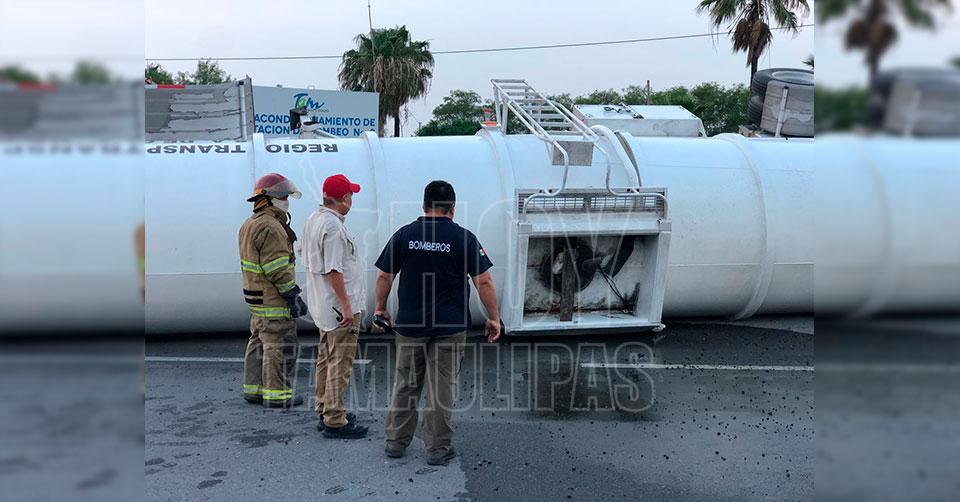 Ciudad Victoria, Tamaulipas. – Un contenedor que transportaba diésel volcó esta tarde al desprenderse de un primer auto tanque, en el kilómetro 14 de la carretera Victoria-Soto La Marina.