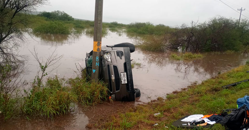 Jiménez, Tamaulipas. - El conductor de una camioneta tipo familiar se salvó de morir ahogado luego de volcar y chocar contra un poste en la carretera Victoria-Matamoros, tras perder el control y derrapar.