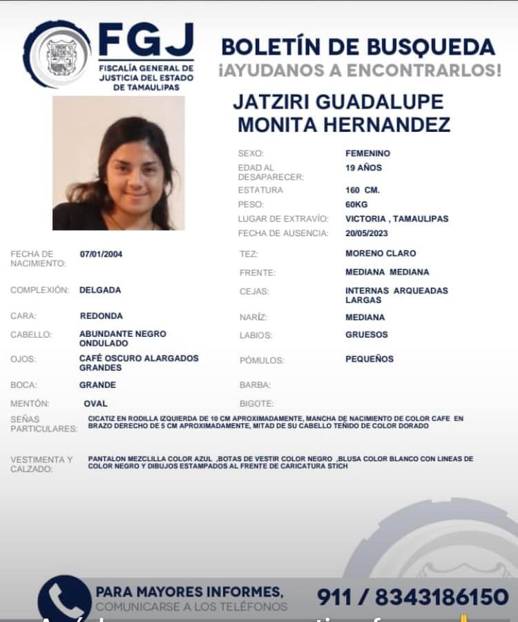 Ciudad Victoria, Tamaulipas. – La Fiscalía General de Justicia de Tamaulipas emitió un boletín de búsqueda para dar con el paradero de Jatziri Guadalupe Monita Hernández quien presuntamente desapareció en Ciudad Victoria.
