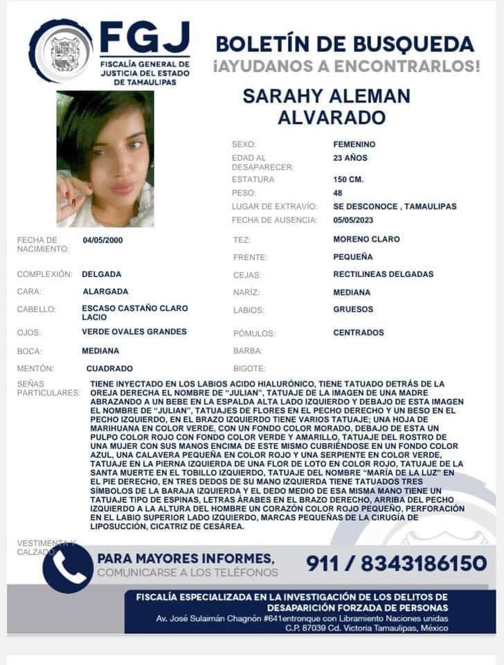 San Fernando, Tamaulipas. – La joven de 23 años de edad, Sarahy Alemán Alvarado es buscada por las autoridades luego de que desapareciera, desde el pasado 5 de mayo.