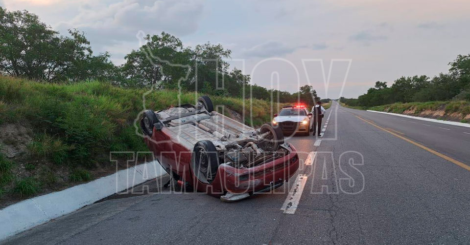 San Fernando, Tamaulipas.- Tras la volcadura de un automóvil sobre el kilómetro 23 del Libramiento San Fernando, personal de la Guardia Estatal acudió como primer respondiente para brindar apoyo vial.