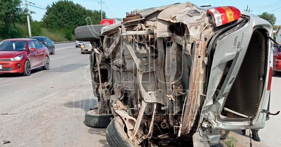 Reynosa, Tamaulipas. - Cuantiosos daños materiales, dejó como saldo un choque y volcadura registrados esta mañana en la carretera Reynosa-Río Bravo, a la altura de la colonia La Joya.