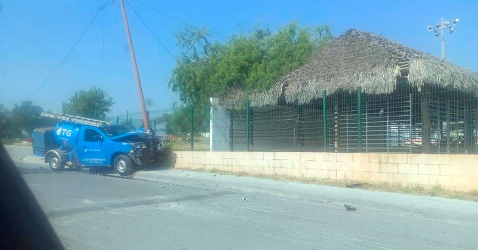 Reynosa, Tamaulipas. - Una pipa repartidora de gas LP se impactó contra una luminaria en Reynosa al quedarse sin frenos, provocando que el combustible que transportaba se fugara.