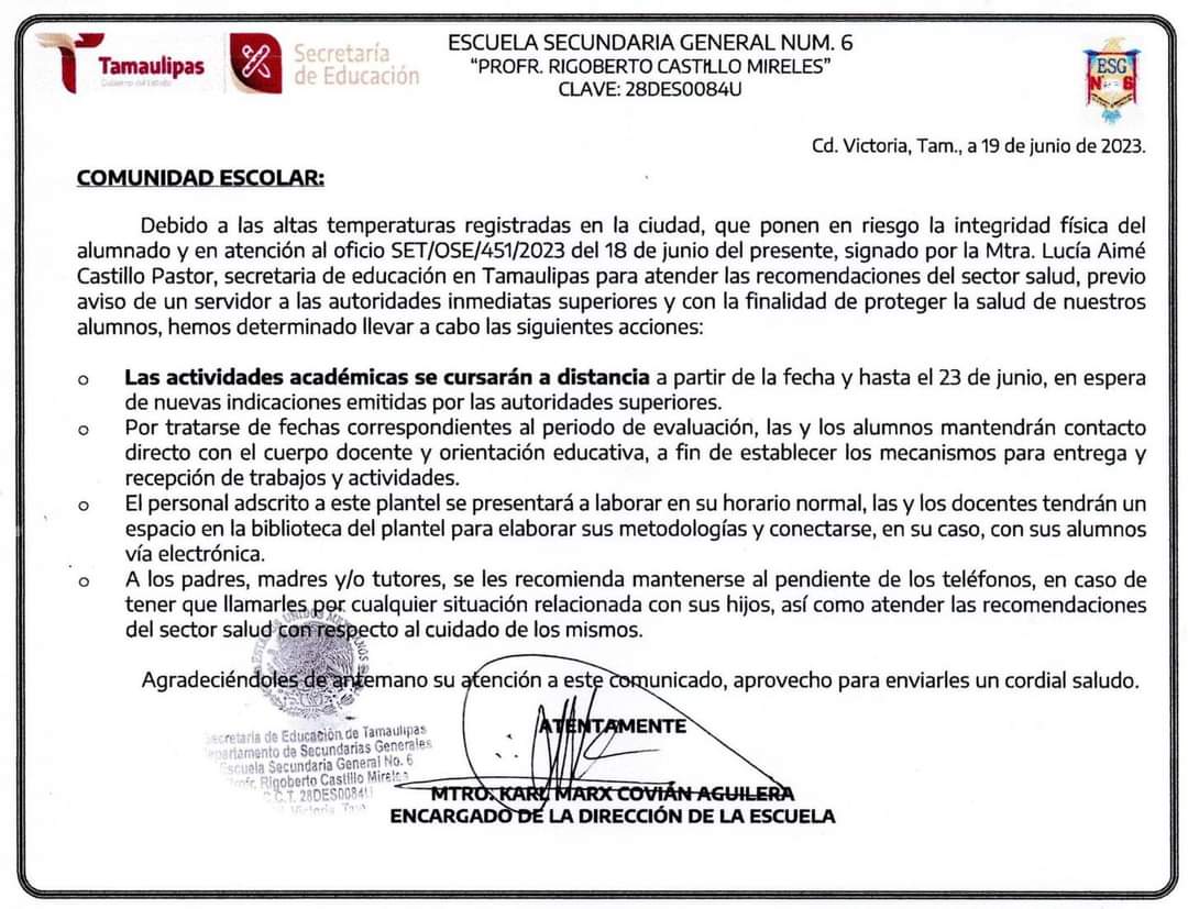 “Se determinó está acción debido a las altas temperaturas registradas en la ciudad, que ponen en riesgo la integridad física del alumnado y en atención al oficio SET/OSE/4S1/2023 del 18 de junio del presente, signado por la Mtra. Lucia Aimé Castillo Pastor, secretaria de educación en Tamaulipas para atender las recomendaciones del sector salud, previo aviso a las autoridades inmediatas superiores y con la finalidad de proteger la salud de los alumnos”.