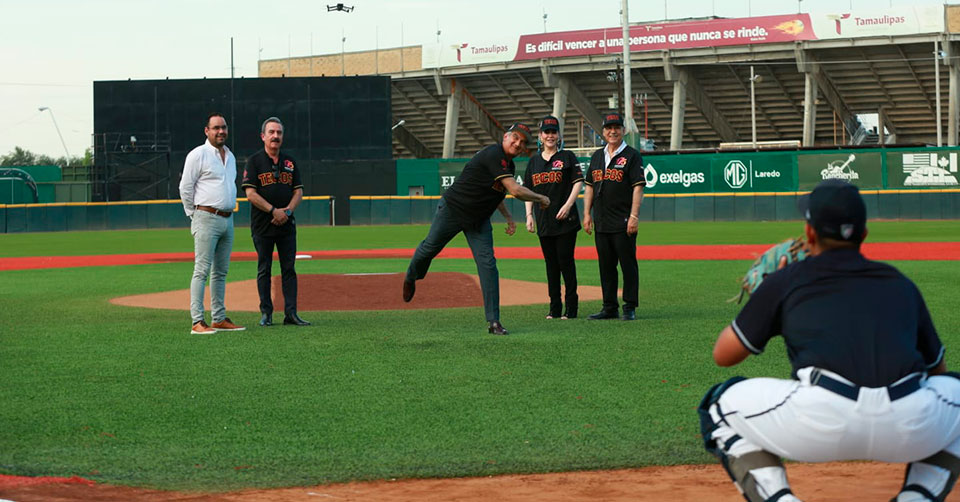 Nuevo Laredo, Tamaulipas.- Como parte de los festejos por el 175 aniversario de esta ciudad, el gobernador del Estado, Américo Villarreal Anaya, realizó el lanzamiento de la primera bola durante el partido entre los Tecolotes de los Dos Laredos y los Mariachis de Guadalajara.