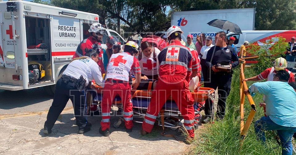 Ciudad Victoria, Tamaulipas. - Una conductora resultó lesionada esta mañana luego de caer volcada junto a su camioneta en un dren pluvial, tras recibir un cerrón por parte de otra unidad motriz que la hizo perder el control y proyectarse al vacío tras derribar unas vallas de contención.