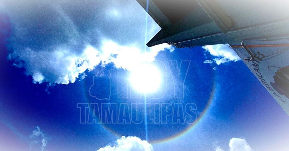 Nuevo Laredo, Tamaulipas. - Este viernes se presentó también en Nuevo Laredo un halo de luz alrededor del sol, lo que causó revuelo en los neolaredenses por la rareza de este fenómeno.