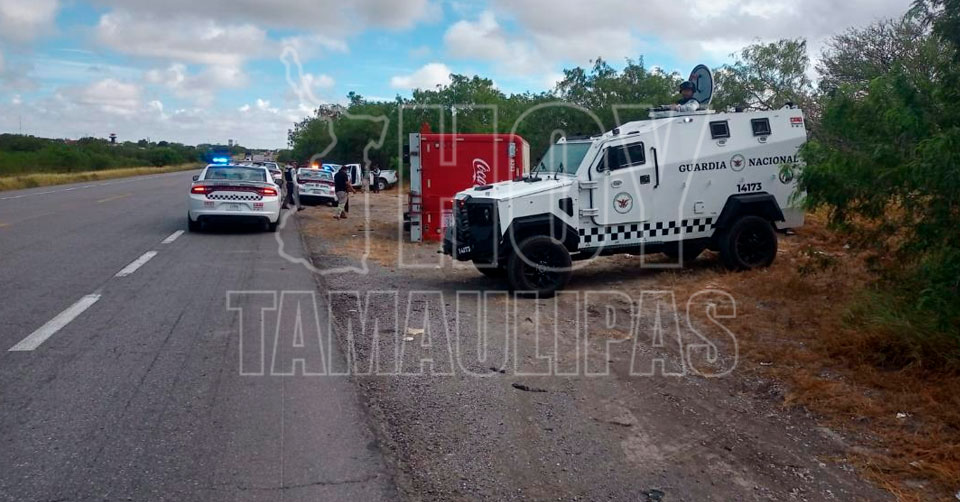 San Fernando, Tamaulipas. - Un camión que transportaba refrescos volcó esta mañana en el kilómetro 24 del Libramiento San Fernando, dejando como saldo daños materiales.