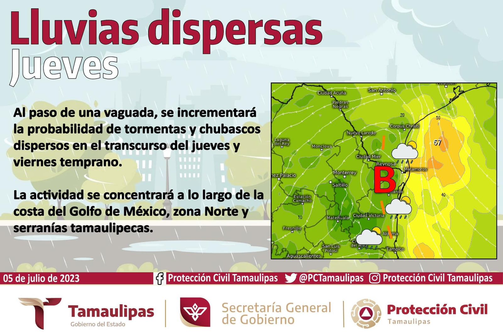 Al paso de una vaguada se incrementará temporalmente la actividad de tormentas y chubascos dispersos en en el territorio tamaulipeco durante el jueves y viernes temprano.