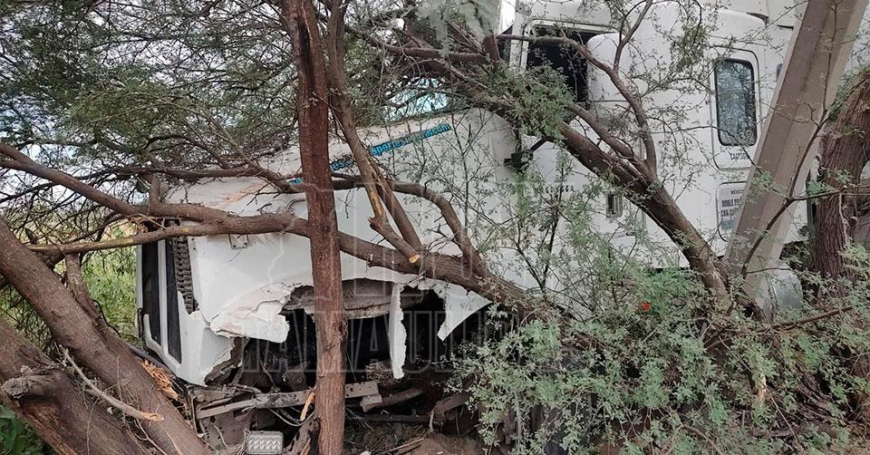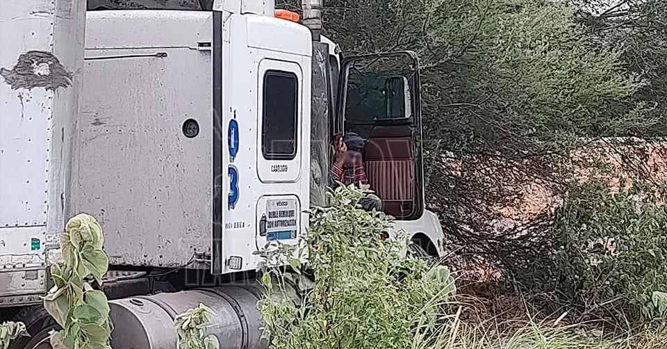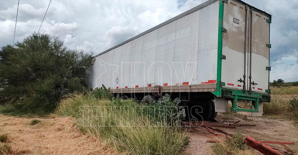 Ciudad Victoria, Tamaulipas. - El chofer de un tráiler perdió el control al volante tras presuntamente quedarse dormido y terminó por derribar la cerca de un rancho hasta internarse entre el monte.