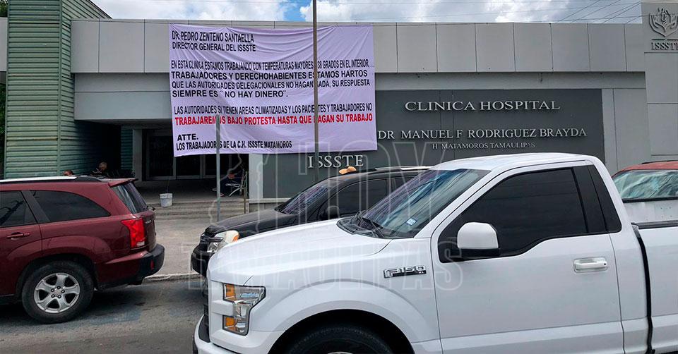 Matamoros, Tamaulipas. - Los trabajadores del Instituto de Seguridad y Servicios Sociales de los Trabajadores del Estado (Issste) en Matamoros se encuentran trabajando bajo protesta, ante la falta de servicios básicos y aire acondicionado del cual carecen desde hace tiempo, es por eso que colocaron una manta en la entrada principal de esta clínica para manifestar su inconformidad.