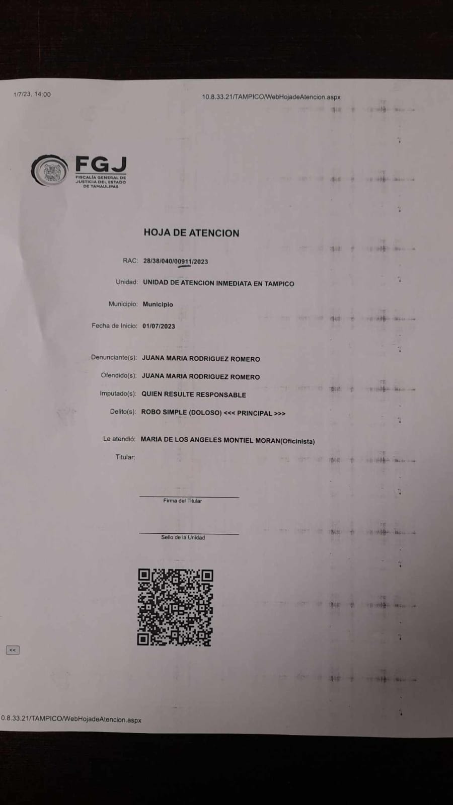 Ante ello acudió a la Fiscalía General de Justicia del Estado de Tamaulipas (FGJT) para denunciar a quien resulte responsable.