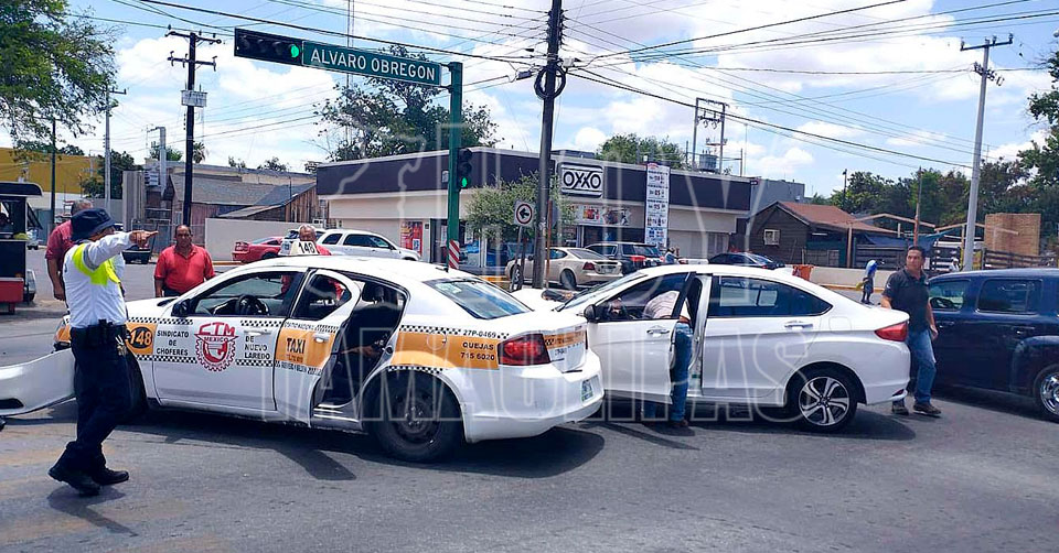 Nuevo Laredo, Tamaulipas.— Tras no respetar la luz roja del semáforo, el conductor de automóvil embistió a un hombre que manejaba un taxi, registrándose daños materiales costosos.