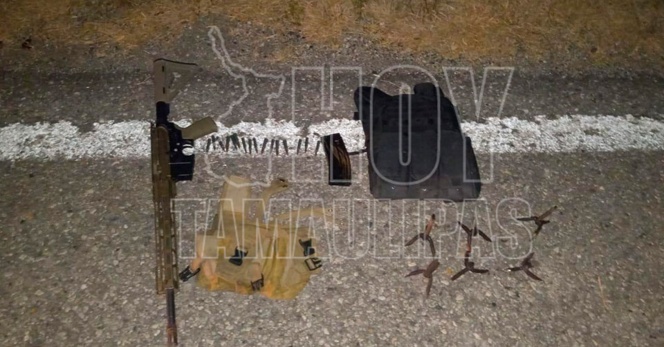 Villa de Casas, Tamaulipas. - Elementos de la Guardia Estatal lograron asegurar una camioneta con blindaje artesanal, armas, chaleco y ponchallantas luego de una agresión y enfrentamiento con civiles armados.