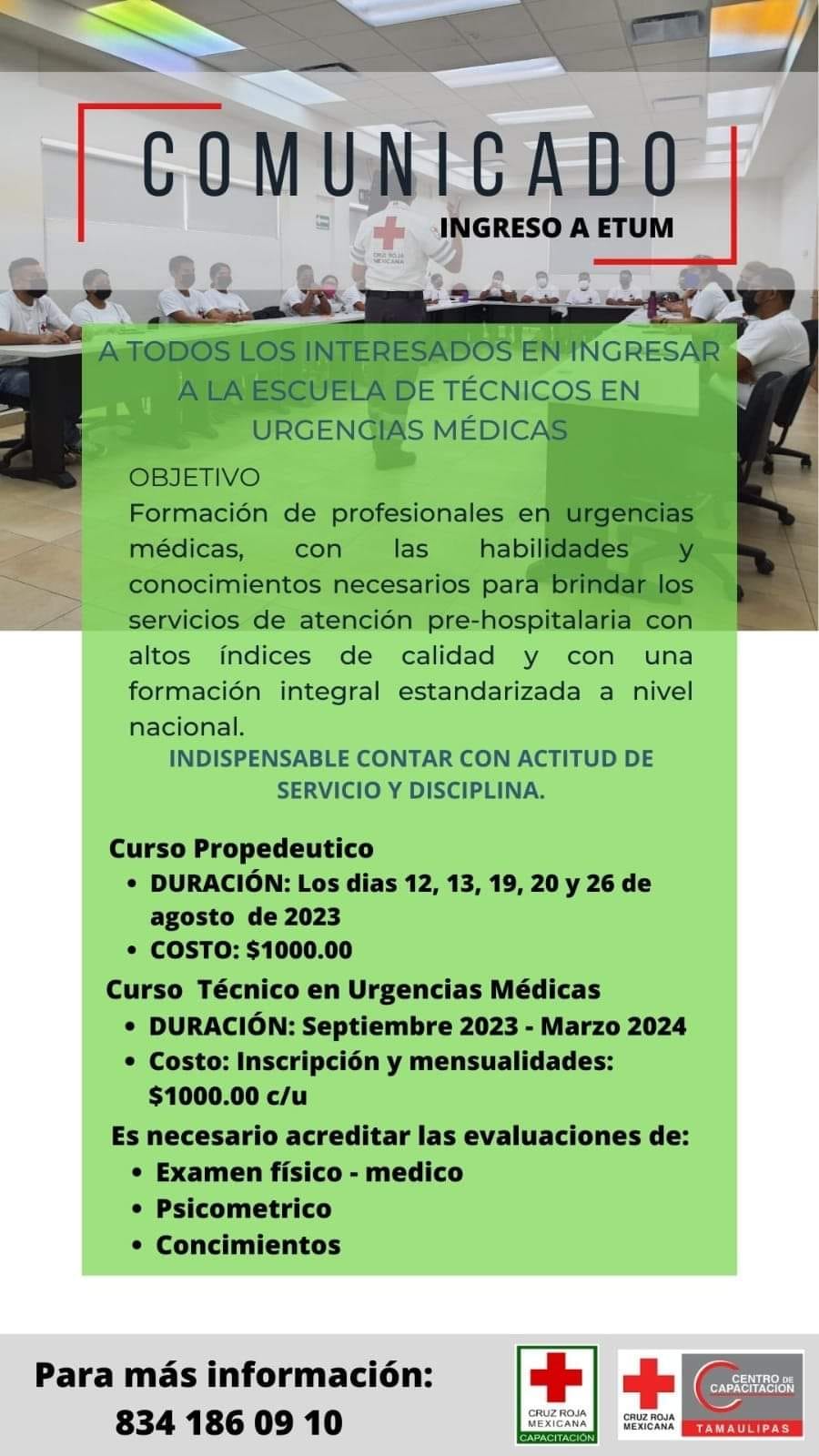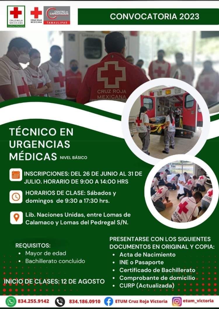 Ciudad Victoria, Tamaulipas. - La Cruz Roja delegación Ciudad Victoria abrió inscripciones para prepararse como Técnico en Urgencias Médicas el cual permitirá a los interesados obtener los conocimientos necesarios para ejercer esta noble labor.