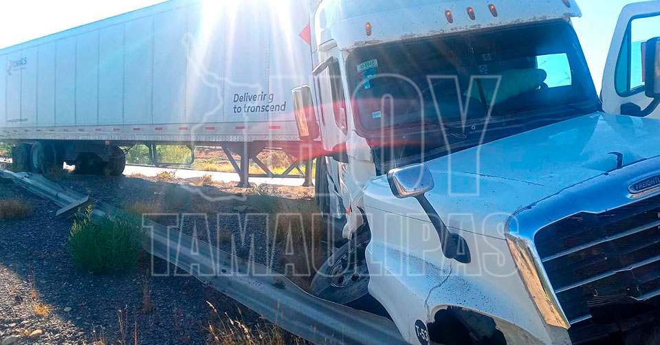 Nuevo Laredo, Tamaulipas. — Al quedarse dormido al volante, el chofer de un tráiler se salió de la Carretera Monterrey-Nuevo Laredo, e impactó el barandal de contención, resultando ileso.