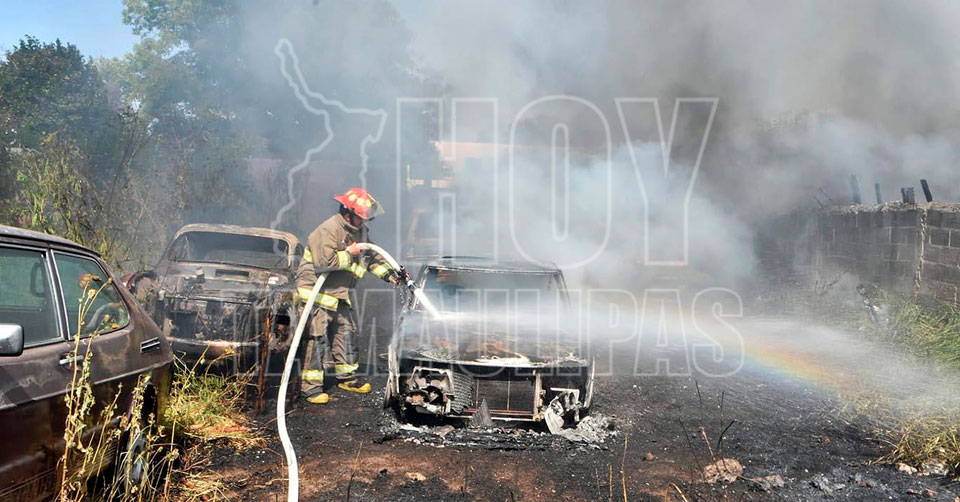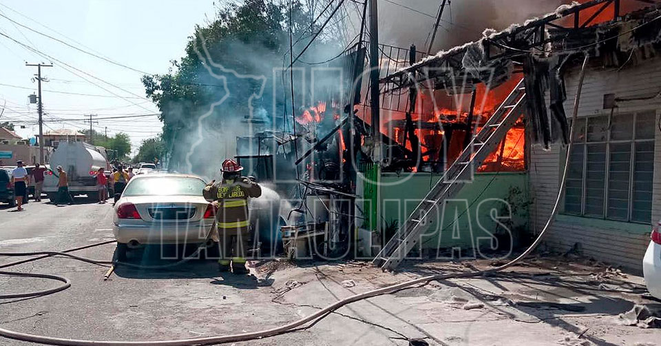 Nuevo Laredo, Tamaulipas.— Un fuerte incendio arrasó con dos viviendas de madera y causó daños en otras dos, además de que el fuego alcanzó cinco vehículos estacionados en un predio.