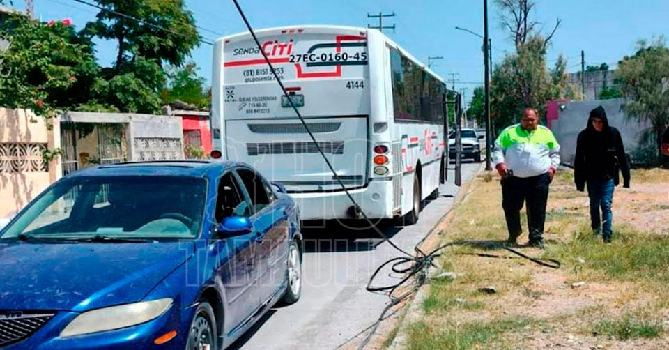 Nuevo Laredo, Tamaulipas.— A su paso por calles de la colonia Francisco Villa en Nuevo Laredo, el chofer de un camión de transporte de personal se enganchó accidentalmente contra el cableado de telefonía y al estirarse provocó que dos postes de madera fueran derribados y una resultara dañada la mufa de una casa.