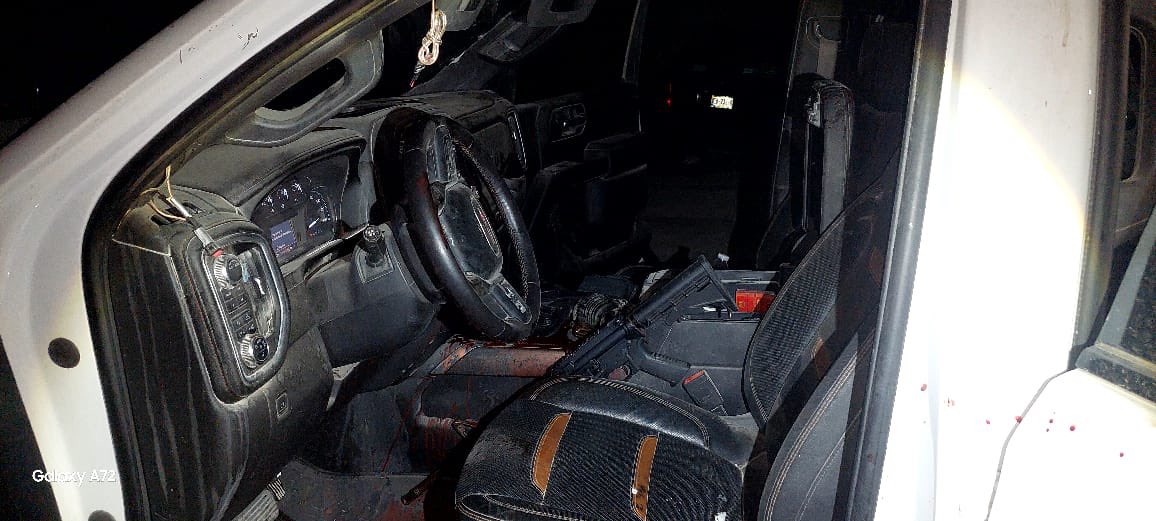 Al percatarse de la presencia policial iniciaron la agresión y comenzó la persecución que culminó en el aseguramiento de una camioneta GMC Sierra AT4 blanca con equipo bélico al interior, mientras que otras más lograron huir entre brechas aledañas.