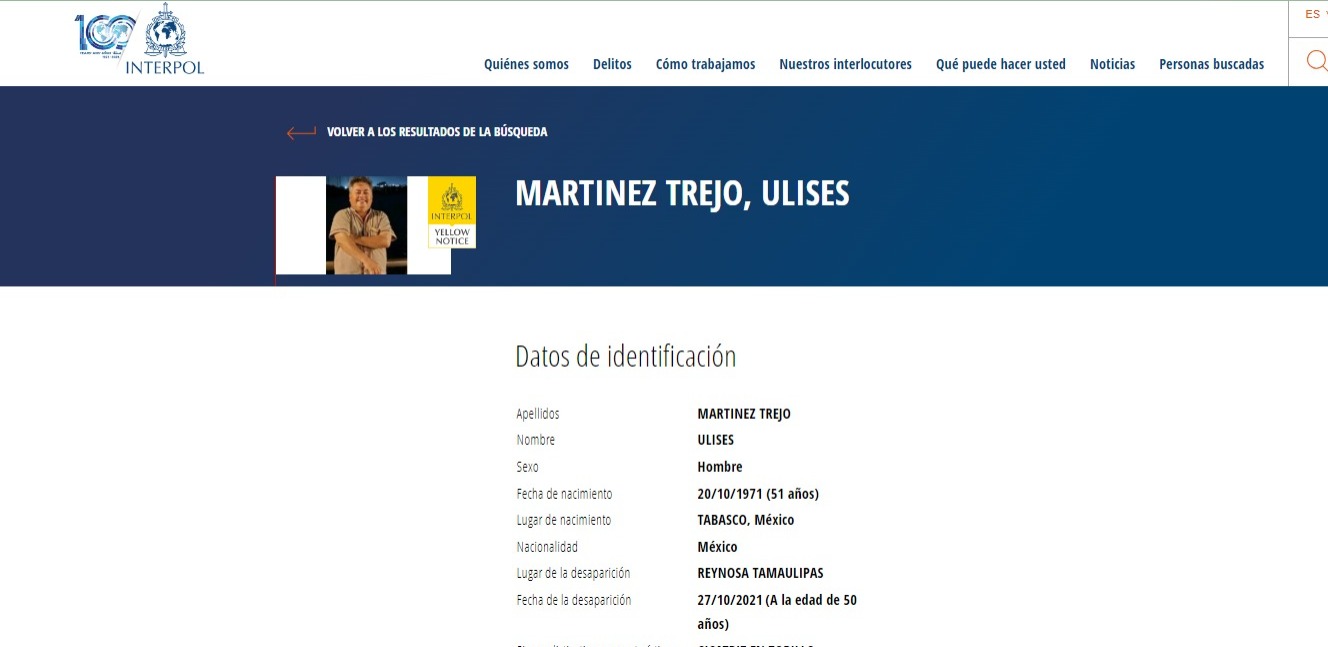 La ficha de búsqueda de la Interpol establece que es originario de Tabasco y desapareció a la edad de 50 años, con signos distintivos y características de “cicatriz en el tobillo”, con una altura de 1.70 metros y peso de 100 kilogramos.