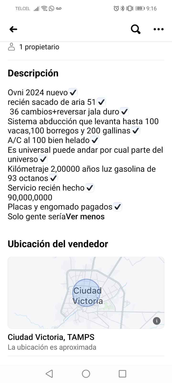 "Vendo ovni del año 2657, viene con pintura de agencia; 137, 000 años luz recorridos, Automático, tiene patente en Marte pero puede volar por todo el universo sin problema, sistema de abducción qué levanta hasta 60 vacas, inmunidad a agujeros negros; usa gasolina de 93 octanos, sin multas estelares, para 4 pasajeros".