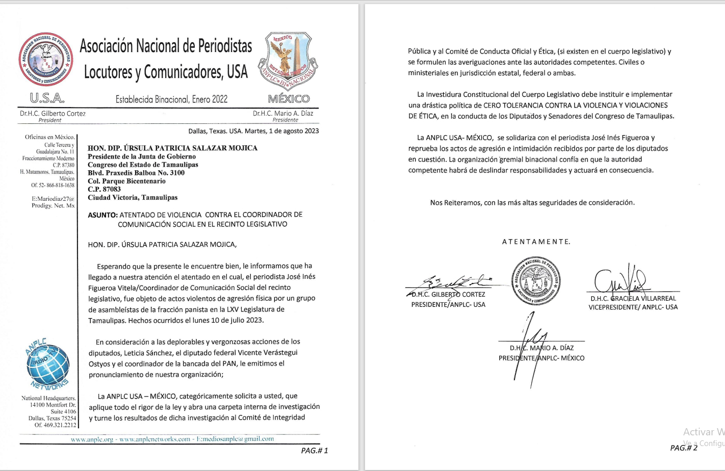Ciudad Victoria, Tamaulipas. – Luego de la agresión que sufrió el jefe de prensa del Congreso de Tamaulipas, José Inés Figueroa Vitela, por parte de legisladores locales y federales del Partido Acción Nacional (PAN) el pasado 10 de julio, la Asociación Nacional de Periodistas Locutores y Comunicadores (ANPLC USA-México) exigen justicia para el también periodista.