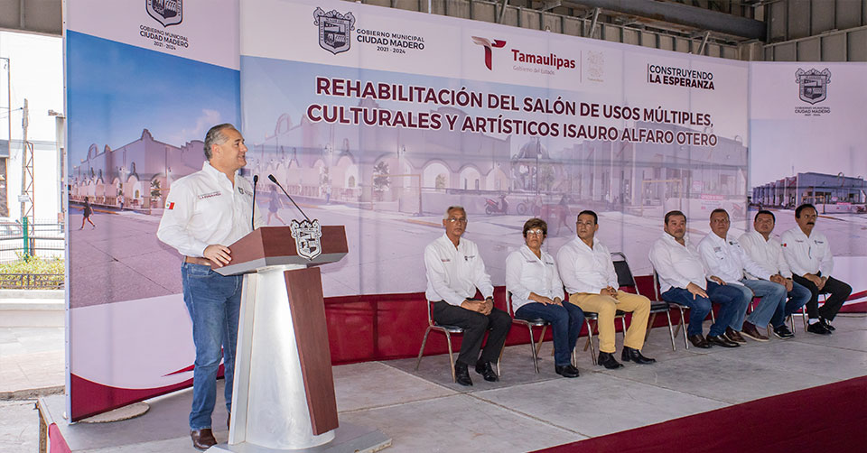 Ciudad Madero, Tamaulipas.- Al reafirmar su compromiso de continuar trabajando para recuperar la grandeza, historia e identidad de Ciudad Madero, el Gobierno que preside el alcalde Adrián Oseguera Kernion, puso en marcha los trabajos de rehabilitación del salón de usos múltiples en la plaza Isauro Alfaro Otero ubicada en el corazón de esta localidad.