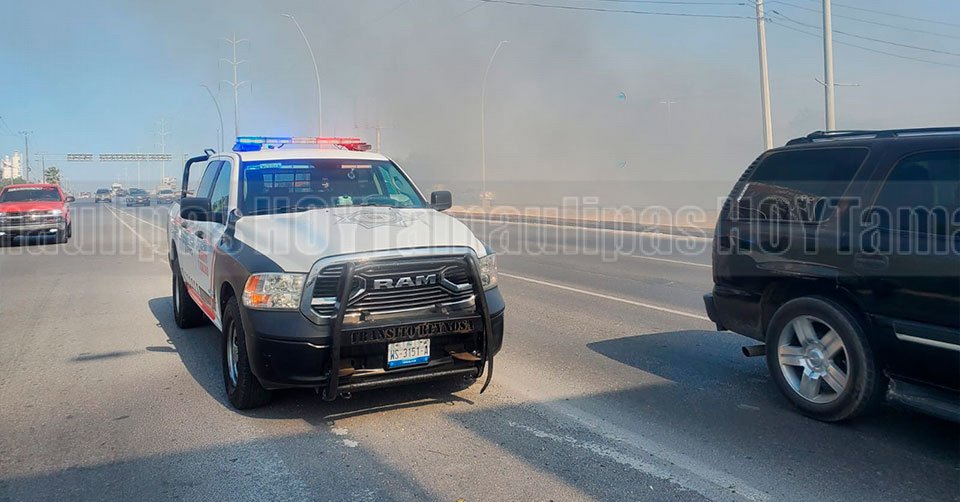 Reynosa, Tamaulipas. - Autoridades de Protección Civil (PC) advirtieron a los automovilistas para que extremen precauciones, por la poca visibilidad que se registra sobre el libramiento Monterrey-Reynosa hacia Río Bravo, ya que a la altura de la colonia López Portillo 3 se combate un incendio de pastizal.