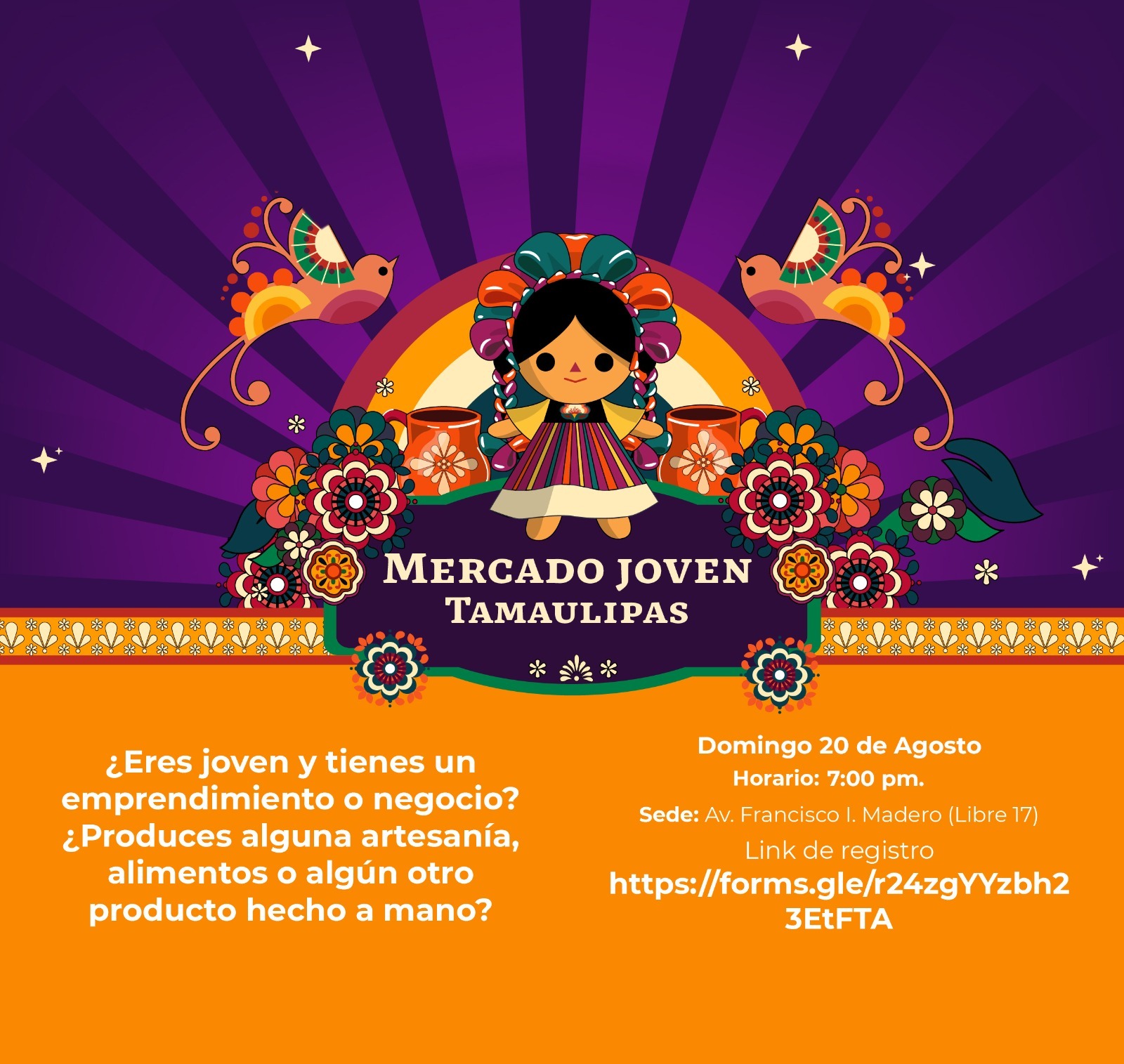 Ciudad Victoria, Tamaulipas.- Será en Ciudad Victoria el primer “Mercado Joven” que se realice en Tamaulipas, iniciativa que busca impulsar y consolidar emprendimientos juveniles a nivel nacional y que forma parte de las estrategias del componente “Comercio Joven”, el cual iniciará actividades el próximo domingo 20 de agosto en el Paseo Méndez (Libre 17) en punto de las 19:00 horas.