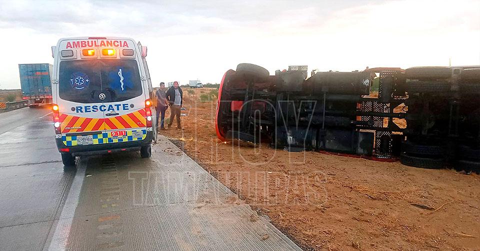 Nuevo Laredo, Tamaulipas.— Un camión que transportaba carga ligera sufrió un accidente en la autopista de la Carretera Monterrey-Nuevo Laredo, luego de que su chofer perdió el control presuntamente por los fuertes vientos que azotaron la zona durante esta tarde.