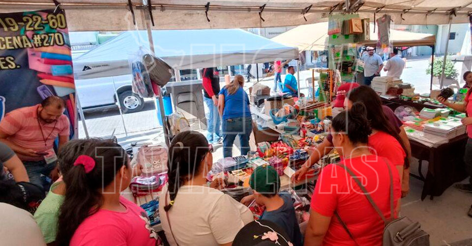 Reynosa, Tamaulipas. - La Feria del Regreso a Clases dio inicio este viernes en Reynosa; participan comerciantes del ramo que durante tres días estarán ofreciendo útiles escolares con precios accesibles en la plaza principal.