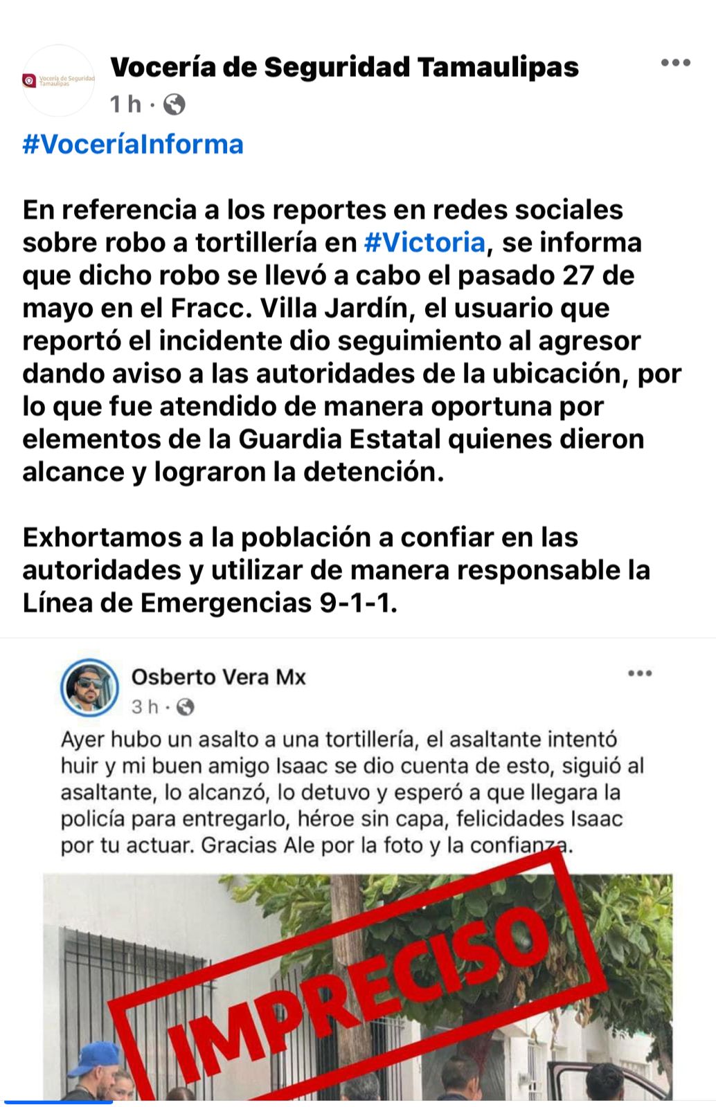 “En referencia a los reportes en redes sociales sobre robo a tortillería en #Victoria, se informa que dicho robo se llevó a cabo el pasado 27 de mayo en el Fracc. Villa Jardín, el usuario que reportó el incidente dio seguimiento al agresor dando aviso a las autoridades de la ubicación, por lo que fue atendido de manera oportuna por elementos de la Guardia Estatal quienes dieron alcance y lograron la detención”, informó oficialmente la Vocería de Seguridad.