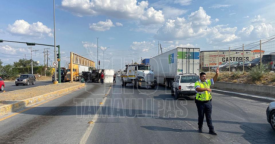 Nuevo Laredo, Tamaulipas.— Un camioncito de tres y media toneladas quedó volcado sobre uno de sus costados, luego de que su conductor no midió correctamente la altura reglamentaria y chocó contra la barrera metálica en un crucero de la Carretera Aeropuerto, en Nuevo Laredo.