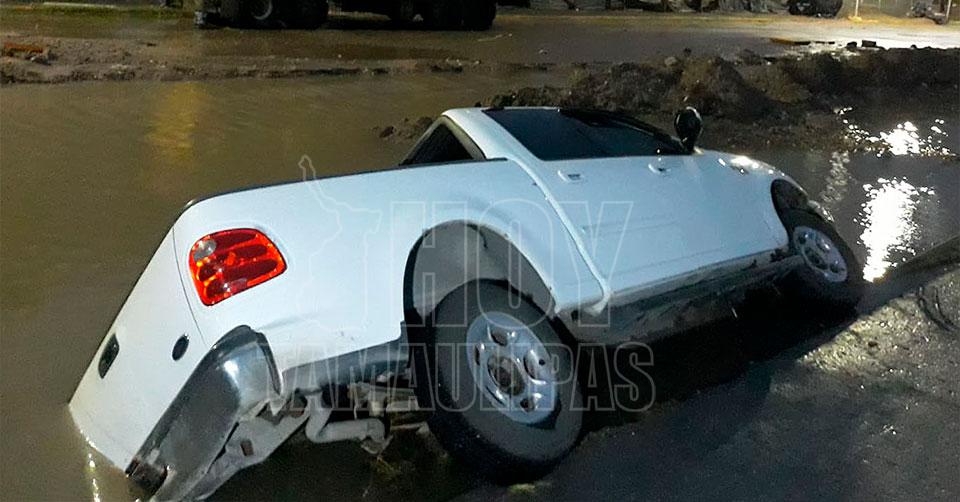 Nuevo Laredo, Tamaulipas. - Un hombre estuvo a punto de morir ahogado al caer con su camioneta en una obra inundada por la intensa lluvia que azotó a Nuevo Laredo por los efectos de la tormenta tropical Harold, hoy por la tarde.