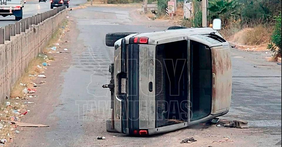 Camioneta volcada y abandonada en la Carretera Nacional de Nuevo Laredo