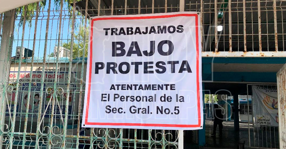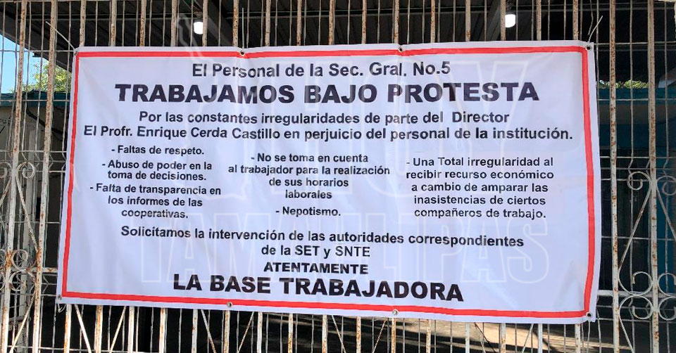 Matamoros, Tamaulipas. – Personal docente de la Secundaria General número 5 en Matamoros trabaja bajo protesta por supuestas irregularidades del director Enrique Cerda, de quien piden su salida a través de mantas colocadas en la entrada al plantel escolar.