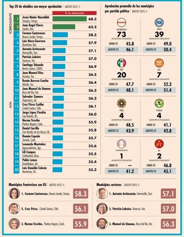 Ciudad Victoria, Tamaulipas. - Los alcaldes de Tampico y Nuevo Laredo, Jesús Nader Nasrallah y Carmen Lilia Canturosas, respectivamente, encabezaron nuevamente la lista de los munícipes mejor evaluados en México, según el ranking de Mitofsky correspondiente al presente mes.