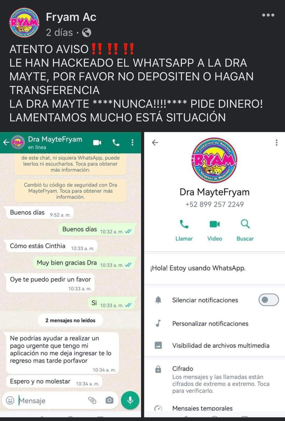 La química Mayte Pineda, titular de Fundación de Rescate y Adopción de Mascotas (Fryam), fue víctima de hackeo de su cuenta de WhatsApp y por ese medio están solicitando dinero a nombre de la fundación.