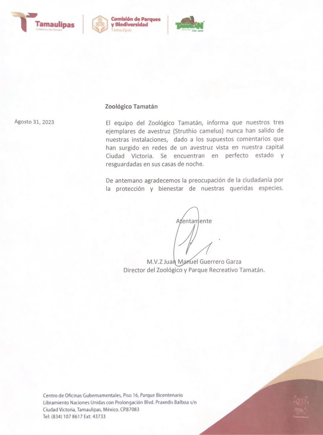 A través de un comunicado la Comisión de Parques y Biodiversidad de Tamaulipas informó que dentro de las instalaciones del Zoológico Tamatán se cuenta con tres avestruces, mismos que se encuentran en el lugar seguros y a salvo.