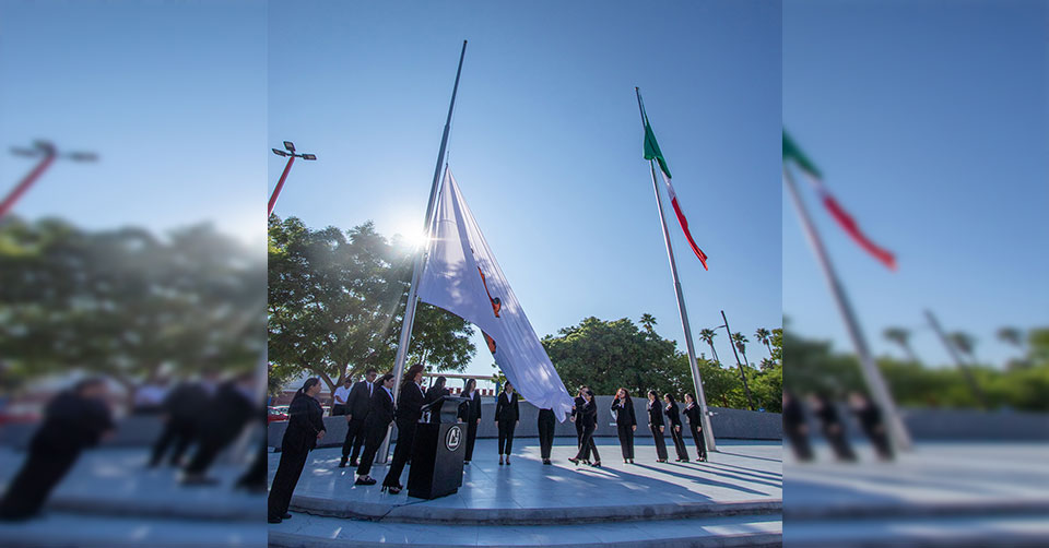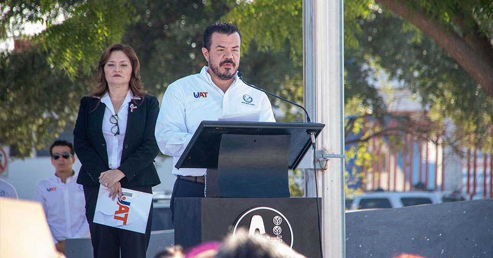 En su mensaje a la comunidad universitaria, el rector destacó la importancia de preservar el respeto a los símbolos patrios, y reiteró el compromiso de la UAT por engrandecer a la nación a través de la educación.