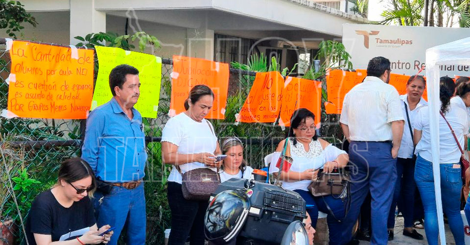 Este día amanecieron los maestros de educación básica en las afueras del Crede, ubicado en el Circuito San Felipe de la colonia Los Pinos, en Tampico, colocando para ello un campamento con sillas, agua y alimentos, en custodia de las citadas oficinas.