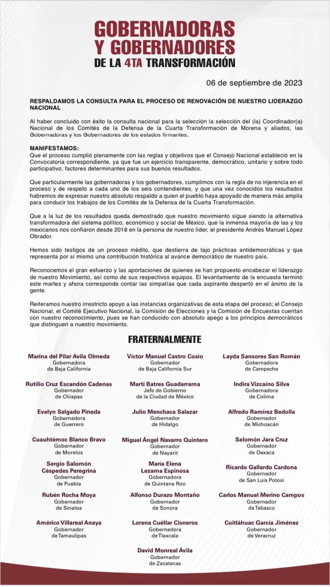 El también mandatario de Sonora, aseguró que “las gobernadoras y los gobernadores, cumplimos con la regla de no injerencia en el proceso y de respeto a cada uno de los seis contendientes, y que una vez conocidos los resultados habremos de expresar nuestro absoluto respaldo a quien el pueblo haya apoyado de manera más amplia para conducir los trabajos de los Comités de la Defensa de la Cuarta Transformación”.